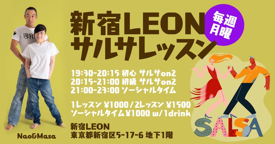 新宿花園神社横のサルサクラブLEONにて開催。超初心者の方からベテランの方、少しお休みしてしまった方のリハビリも何でも来いの、楽しいレッスンです。気楽に覗きに来てくださいね!